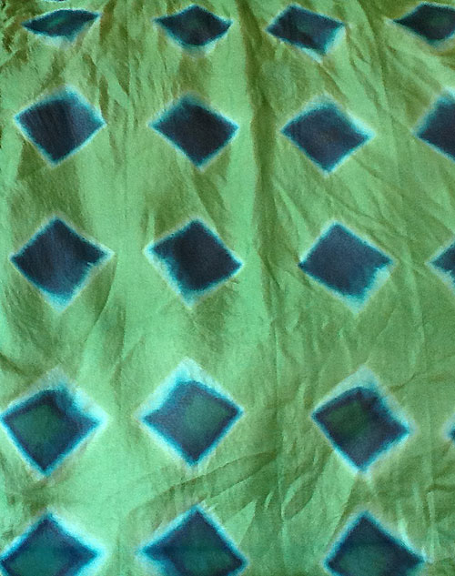 This is work I started doing at Penland School of Crafts in North Carolina this summer. I got to study with two inspiring fabric artists who work in surface design. This silk scarf started out white, was resist dyed with one color and came out with four colors! Pretty much fun and often full of surprises…happy accidents.