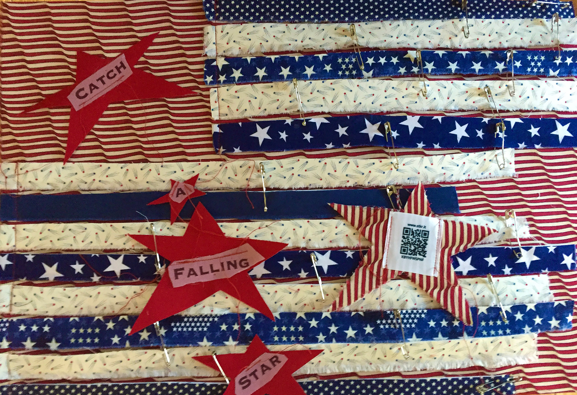A Falling Star A Falling Star 29”x21” Framed and matted Cotton, safety pins, embedded music Can we survive? Posted in Fabric CollageTagged Featured